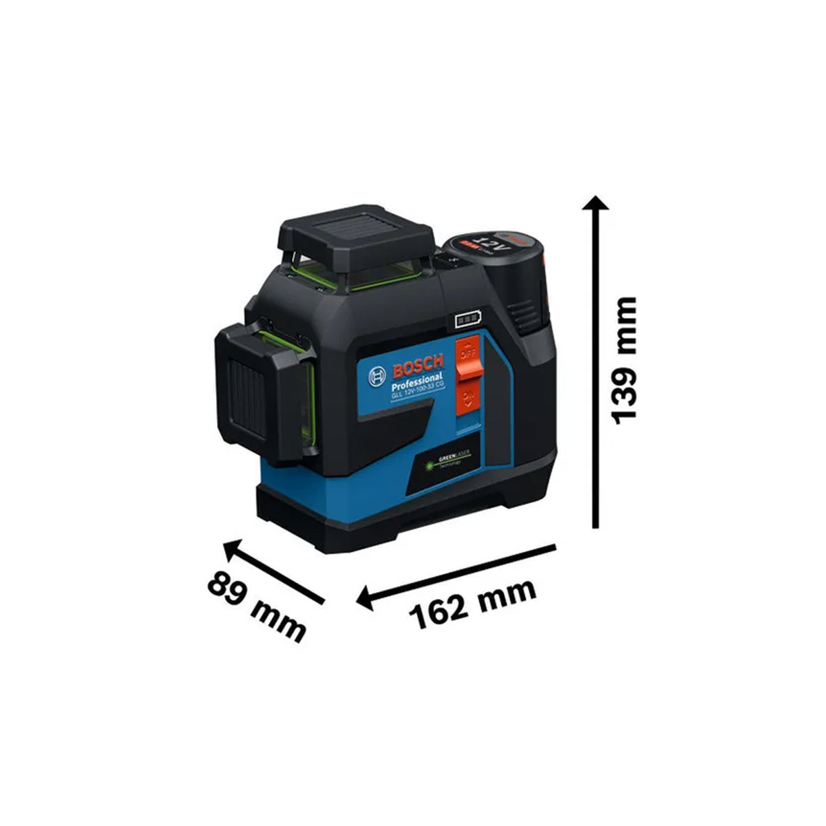 - Απολαύστε τον εύκολο χειρισμό του GLL 12V-100-33 CG με έναν νέο σχεδιασμό πληκτρολογίου για σαφή επιλογή ακτίνας λέιζερ και μια μεγάλη ένδειξη της μπαταρίας για άνεση.