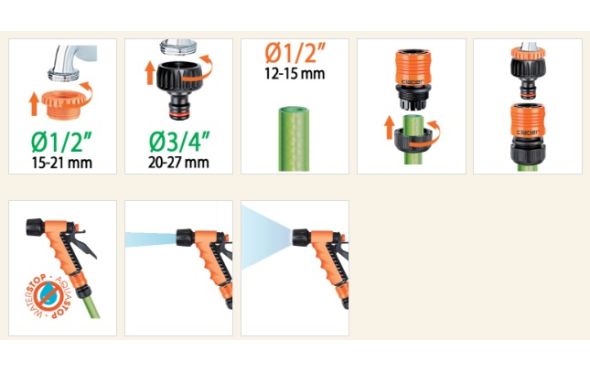 Περιλαμβάνει πιστόλι ψεκασμού με εργονομική λαβή, ρύθμιση και κλειδώμα της δέσμης νερού, η οποία είναι πολύ χρήσιμη για την αποφυγή της κόπωσης των χεριών, ένα βύσμα σύνδεσης 3/4 "με 1/2 "μειωτήρα που είναι εύκολο να εγκαταστήσετε χωρίς εργαλεία, δύο αυτόματες συνδέσεις Quick-Click, μία με τη συσκευή Aquastop, που σας επιτρέπει να συνδέσετε και να αποσυνδέσετε το πιστόλι χωρίς να χρειάζεται να κλείσετε τη βρύση.