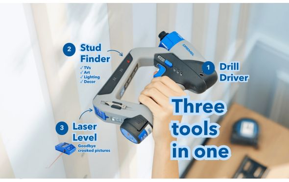 - Τρία εργαλεία εργασίας σε ένα συμπαγές δράπανο, φιλικό προς τον χρήστη, περιλαμβάνει ενσωματωμένο ανιχνευτή, αποσπώμενο λέιζερ και αλφάδι.