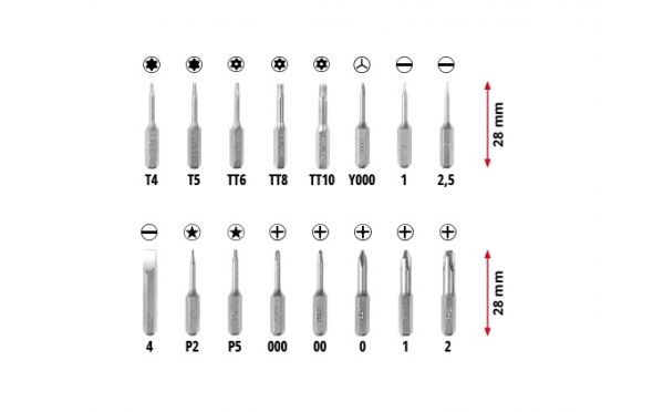 | 16 Μύτες ακριβείας: PH0 / PH00 / PH000 / PH1 / PH2 / SL1 / SL2.5 / SL4 / T4 / T5 / TT6 / TT8 / TT10 / P2 / P5 / Y000 (28mm / 4 mm hex) |