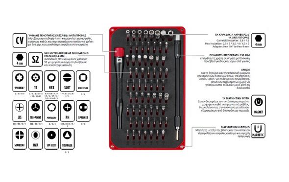 - Το σετ περιέχει πρόσθετα εργαλεία ακριβείας που διευρύνουν τη γκάμα των εργασιών που μπορούν να εκτελεστούν.
