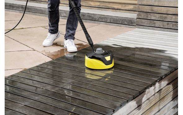 - Ο περιστρεφόμενος βραχίονας διπλής δέσμης του μηχανήματος καθαρισμού τοίχων και δαπέδων Τ 5 Τ-Racer μπορεί να απομακρύνει ρύπους από μεγάλες επιφάνειες – για γρήγορο και αποτελεσματικό καθαρισμό μεγάλων εξωτερικών χώρων.