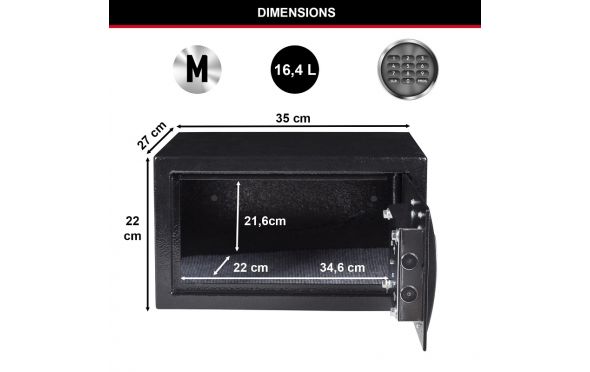 - Η προγραμματιζόμενη ηλεκτρονική κλειδαριά σας επιτρέπει να επιλέξετε τον συνδυασμό σας, ενώ το έξτρα κλειδί διασφαλίζει ότι θα έχετε πάντα πρόσβαση στο χρηματοκιβώτιο σας, ακόμα και στην περίπτωση που ξεχάσετε τον συνδυασμό.