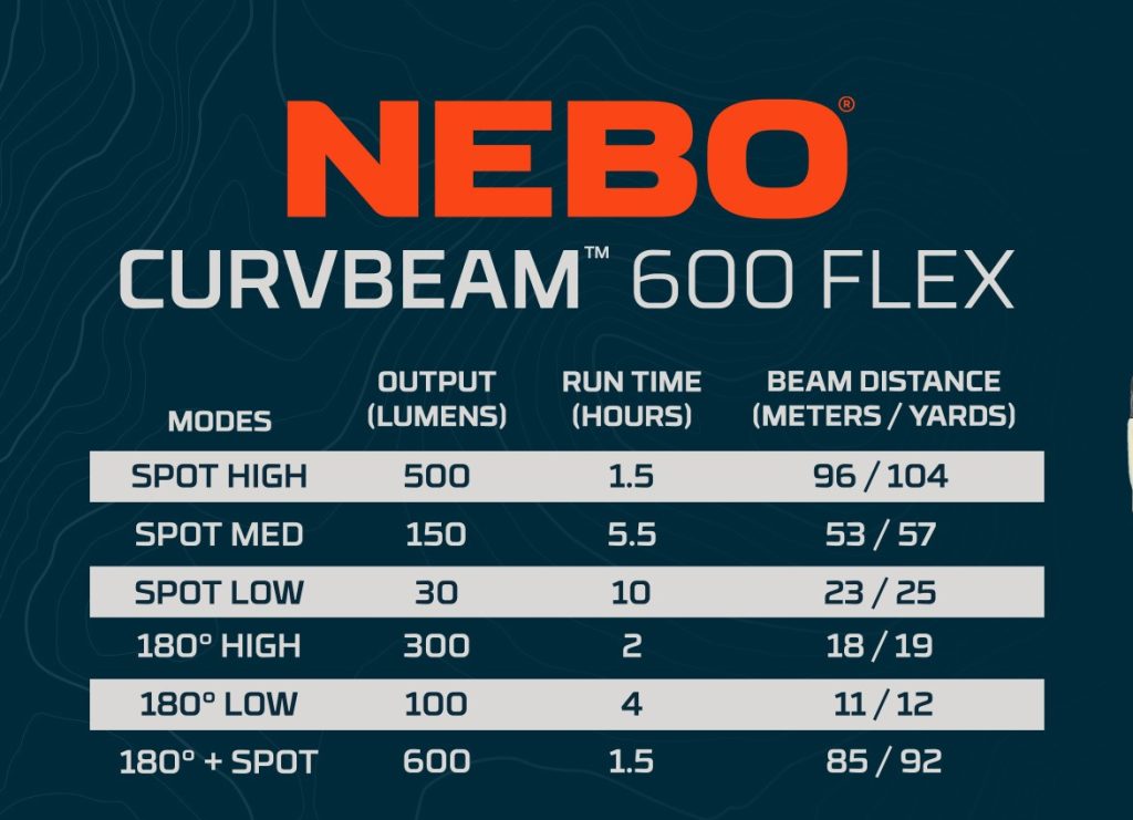 - Ο φακός κεφαλής CURVBEAM™ 600 FLEX της ΝΕΒΟ συνδυάζει ένα ισχυρό εστιασμένο φως με ένα περιμετρικό διάχυτο φως 180°, όλα μαζί σε έναν άνετο, μικρού μεγέθους σχεδιασμό.