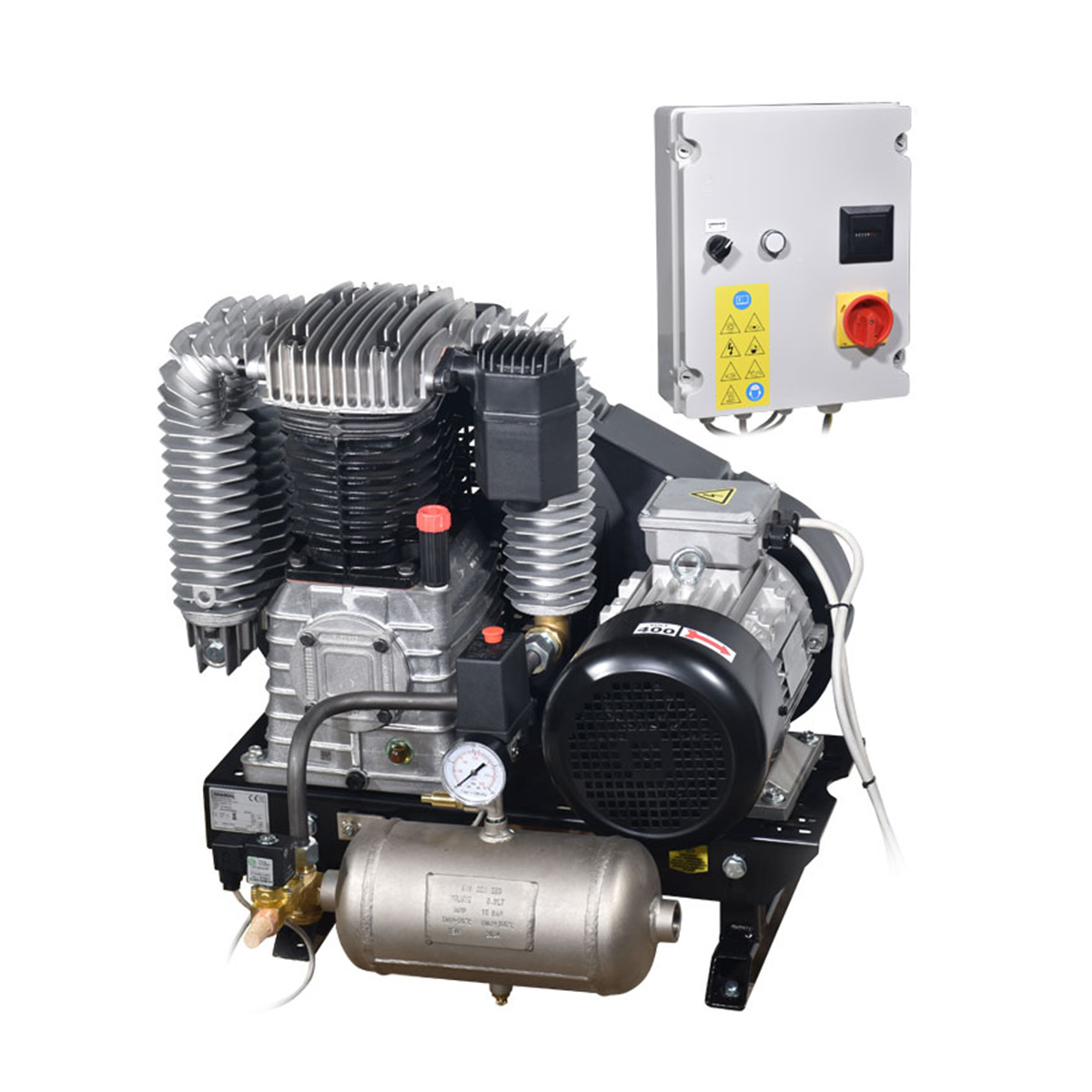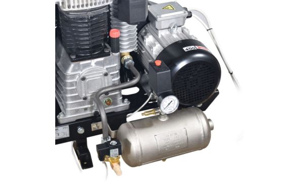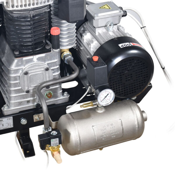 - Ο αεροσυμπιεστής διαθέτει καζανάκι προσυγκεντρώσεως 3,3 λίτρα με αντεπίστροφη , πιεσοστάτη , ηλεκτροβαλβίδα 24 Volt , βαλβίδα ασφαλείας, μανόμετρο και 4 αντικραδασμικά πέλματα.