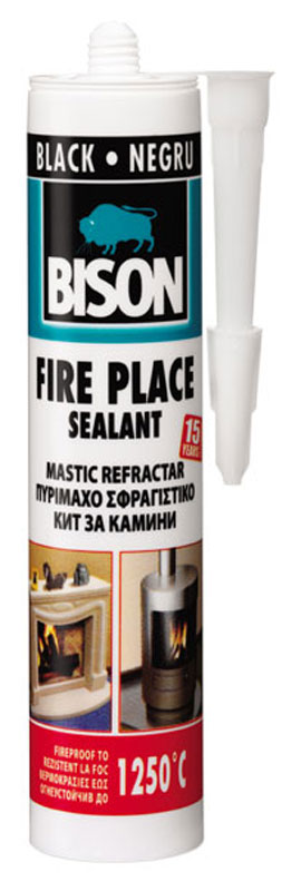 Πυρίμαχο σφραγιστικό Bison για θερμοκρασίες έως 1250 °C. Κατάλληλο για επισκευή ρωγμών και σφράγιση αρμών σε τζάκια, φούρνους και καπνοδόχους. Τοποθετείται σε μέταλλο, τούβλο, πέτρα και σκυρόδεμα. Ακατάλληλο για συστήματα κεντρικής θέρμανσης και σωλήνες αερίου. Χρώμα: μαύρο
