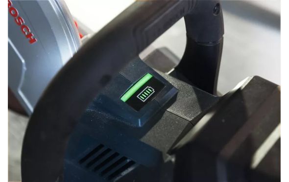 • Το πριόνι κοπής GCS 18V-230 διαθέτει επίσης ένα σύστημα αφαίρεσης μπαταρίας με υποβοήθηση ελατηρίου. που καθιστά εύκολη την αφαίρεση μεγαλύτερων μπαταριών 18 V, όταν οι μπαταρίες πρέπει να επαναφορτιστούν ή οι τροχοί πρέπει να αλλάξουν.