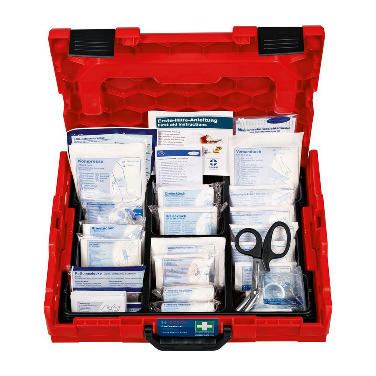 - Είμαστε στην ευχάριστη θέση να σας βοηθήσουμε: Το σετ πρώτων βοηθειών Bosch Professional είναι συμβατό με το DIN 13157 και διατίθεται σε ένα L-BOXX 102, το οποίο αποτελεί μέρος του συστήματος μεταφοράς Bosch.