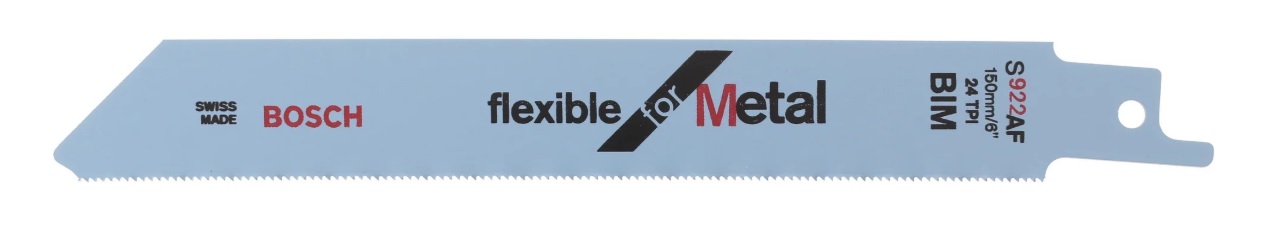 Η σπαθόλαμα S 922 AF Flexible for Metal πραγματοποιεί εύκολες κοπές σε μέταλλο. Το πολύ λεπτό βήμα δοντιού και τα κυματοειδή δόντια επιτρέπουν ομαλές κοπές σε λεπτά υλικά. Επιπλέον, η διμεταλλική λάμα είναι κατασκευασμένη να έχει μεγάλη διάρκεια ζωής όταν χρησιμοποιείται για χάλυβα κανονικής αντοχής. Διαθέτει ένα πολύ λεπτό βήμα δοντιού (1 mm) για κοπή χαλύβδινων σωλήνων και προφίλ με πάχος τοιχωμάτων από 0,7 mm έως 3 mm. Το τυπικό της μήκος 150 mm εξασφαλίζει ικανότητα κοπής έως και 100 mm. Για χρήση με σπαθόσεγα σε συστήματα με στέλεχός γενικής χρήσης 1/2 ίντσας. Λεπτές λαμαρίνες (0,7-3 mm), λεπτοί σωλήνες/προφίλ (Ø <100 mm), ξεκούραστη, λεπτή κοπή.