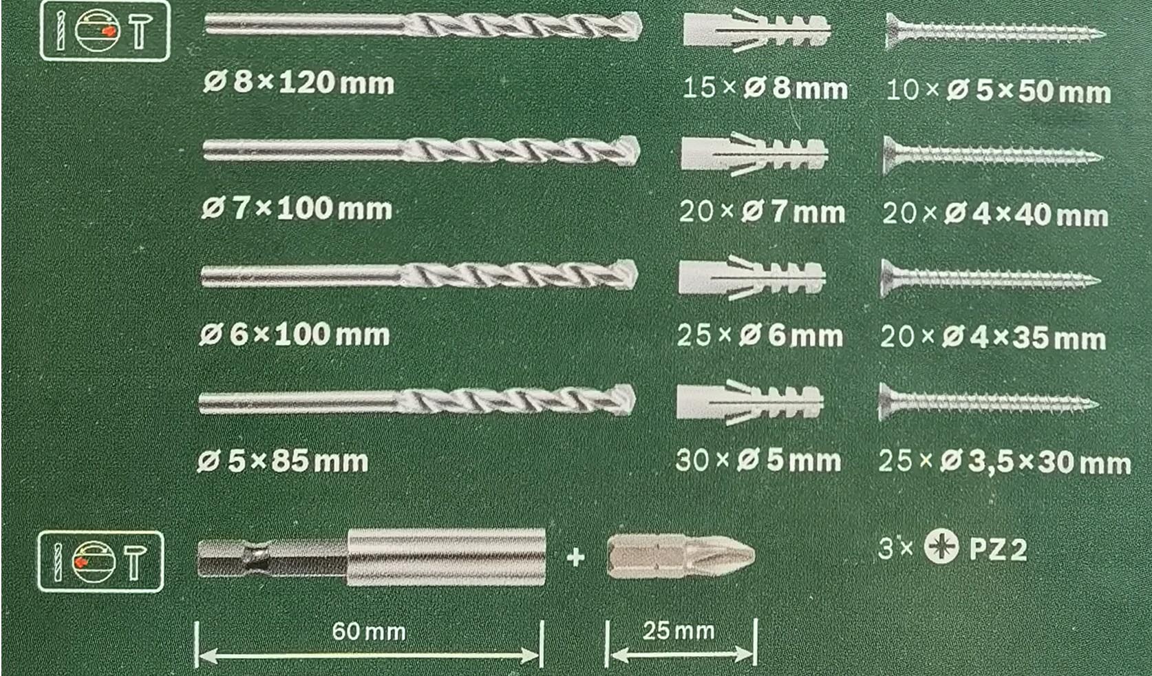 | 75 βίδες : 25τεμ. 3.5 x 30, 20τεμ. 4.0 x 35, 20τεμ. 4.0 x 40, 10τεμ. 5.0 x 50. |