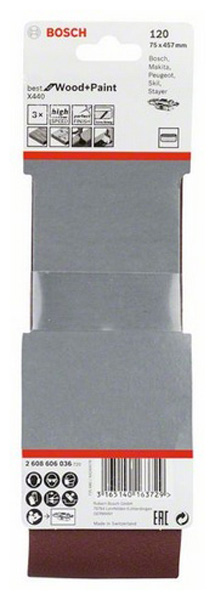 BOSCH - Σετ Ταινιών Λείανσης 3 τεμαχίων 75x457mm - K120