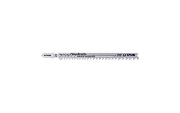 Το T 367 XHM Progressor for Wood and Metal Jigsaw Blade έχει υψηλή αντοχή για γρήγορες, ευθείες κοπές σε παχύ και λεπτό ξύλο με μέταλλο. Η γεωμετρία δοντιών με το προοδευτικά αυξανόμενο βήμα δοντιού επιτρέπει κοπές σε υλικά μιας γκάμας πυκνοτήτων. Επιπλέον, τα τροχισμένα δόντια του είναι πλάγια για γρήγορες κοπές σε ευρεία γκάμα διαφορετικών υλικών από ξύλο και μέταλλο. Η οδόντωση της λάμας είναι συγκολλημένη σε ένα πολύ ελαστικό σώμα από ανθρακοχάλυβα με τεχνολογία καρβιδίου, που επιτρέπει την κοπή πολύ σκληρών υλικών ξύλου με ενσωματωμένο μέταλλο και τμήματα χάλυβα υψηλής αντοχής (π.χ. επισκληρυμένα καρφιά, επισκληρυμένες βίδες). Το μεγάλο, προοδευτικό βήμα δοντιού (3,5-5 mm) και το μεγάλο μήκος της (132 mm) κόβουν ευρεία γκάμα υλικών με πάχος έως 65...