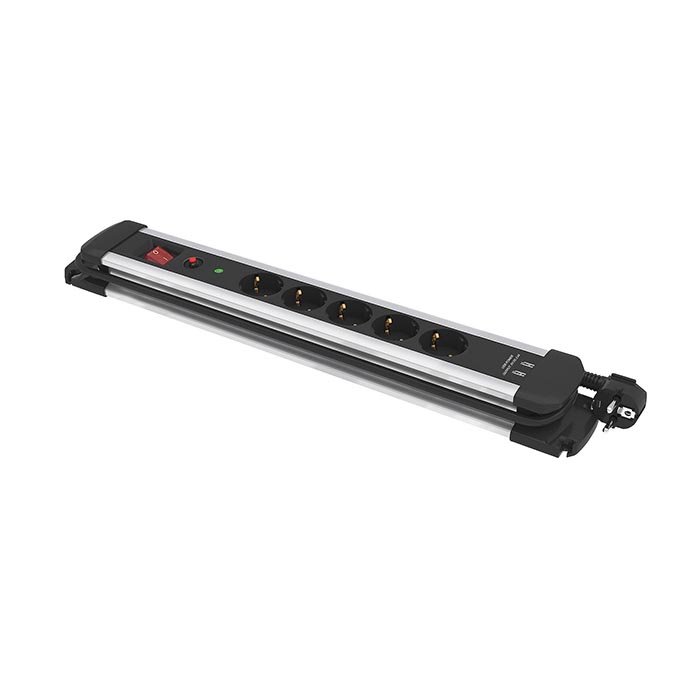 Φωτιζόμενος διακόπτης.Προστασία υπέρτασης.Προστασία υπερφόρτωσης.2 θύρες USB 2.4A.5 πρίζες σούκο.Μηχανικό κλείδωμα πρίζας.