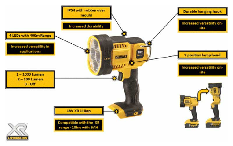 DEWALT - DCL043 Φακός Led 1000Lumens - Χωρίς Μπαταρία & Φορτιστή (Solo)