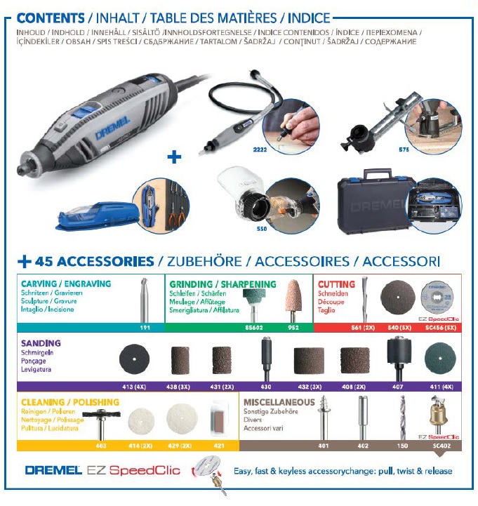- Εκτελέστε την ευρύτερη γκάμα εφαρμογών σε οποιοδήποτε υλικό χάρη στη συμβατότητά του με όλα τα εξαρτήματα και προσαρτήματα της Dremel, συμπεριλαμβανομένου του EZ SpeedClicκαι της νέας γκάμας των εξαιρετικά ανθεκτικών εξαρτημάτων Dremel MAX.