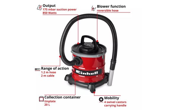 Το πτυχωτό φίλτρο φιλτράρει τη λεπτή σκόνη και τη σκόνη στάχτης. Το προ-φίλτρο αποτρέπει το γρήγορο φράξιμο του πτυχωτού φίλτρου.Μεγάλο δοχείο συλλογής χωρητικότητας 20 λίτρων. Εύκολο άδειασμα του δοχείου χάρη στους ταχυσυνδέσμους ασφάλισης.Ευέλικτη και εύκολη μετακίνηση με 4 περιστρεφόμενους τροχούς. Πρακτική χειρολαβή μεταφοράς για άνετη μετακίνηση. Λειτουργία φυσητήρα για καθαρισμό δυσπρόσιτων σημείων.Για την απομάκρυνση κρύας στάχτης από το τζάκι