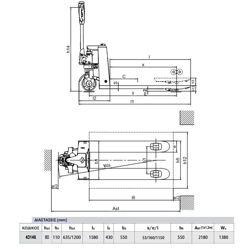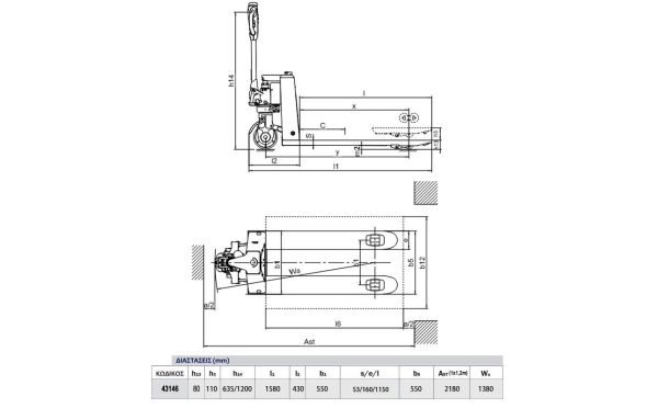 | Διαστ. πιρουνιών: 1150x550 mm (για ευρωπαλέτες) |