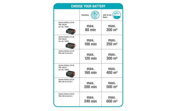 - Με την μπαταρία που περιλαμβάνεται, ο χρόνος λειτουργίας είναι έως 100 λεπτά ή κόβει 250 τετραγωνικά μέτρα.
