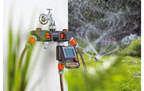 Στην τετραπλή παροχή μπορείτε να συνδέσετε δύο προγραμματιστές ή χρονοδιακόπτες ποτίσματος GARDENA. Η τετραπλή παροχή μπορεί να μετατραπεί σε σύστημα μέγιστης ροής Profi GARDENA με το ρακόρ με σπείρωμα του συστήματος μέγιστης ροής Profi (Κωδ. πρ. 2801-20).