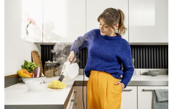 Η συμπαγής σφουγγαρίστρα ατμού SC 1 Multi & Up 4 σε 1 καθαρίζει χωρίς χημικά και μπορεί να χρησιμοποιηθεί αστραπιαία για βαθύ καθαρισμό σε όλο το σπίτι, είτε ως πολυλειτουργικός ατμοκαθαριστής χειρός είτε ως ευέλικτη σφουγγαρίστρα ατμού 3 σε 1 χάρη στο σετ ακροφυσίων δαπέδου EasyFix Large που περιλαμβάνεται. Λειτουργώντας σε τρεις διαφορετικές θέσεις συσκευής - πάνω, στη μέση και κάτω - προσαρμόζεται τέλεια στις ατομικές απαιτήσεις. Ο σχολαστικός καθαρισμός με τον ατμοκαθαριστή Kärcher απομακρύνει έως και 99,999% των ιών* και 99,99% όλων των κοινών οικιακών βακτηρίων** από τις σκληρές επιφάνειες. Ο συμπαγής και πρακτικός σχεδιασμός της συσκευής την καθιστά άνετη στη χρήση και εύκολη στην αποθήκευση στον πιο μικρό χώρο. Ο SC 1 Multi & Up είναι έτοιμος για χρήση...