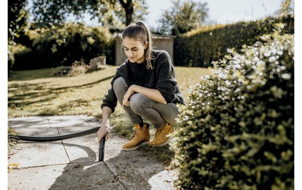 - Χάρη στο φίλτρο φυσιγγίου ενός τεμαχίου, είναι δυνατό να σκουπίζεις τόσο υγρούς και ξηρούς ρύπους χωρίς αντικατάσταση φίλτρου. Μέσω της ενσωματωμένης πρίζας με αυτόματο διακόπτη on/off, μπορούν να συνδεθούν ηλεκτρικά εργαλεία όπως πριόνια ή μύλοι και η βρωμιά που προκύπτει να αναρροφηθεί απευθείας.