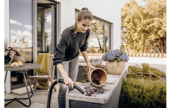 - Η αφαιρούμενη λαβή με ηλεκτροστατική προστασία επιτρέπει την τοποθέτηση αξεσουάρ απευθείας στον εύκαμπτο σωλήνα αναρρόφησης.