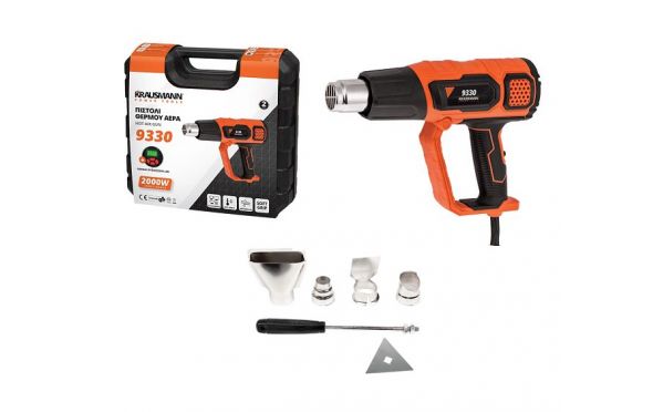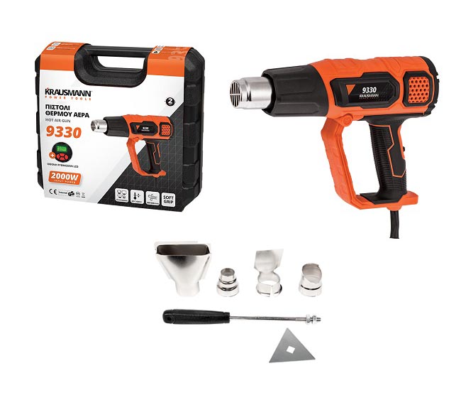 - Το πιστόλι θερμού αέρα KRAUSMANN® με ηλεκτρονικό έλεγχο ροής και θερμοκρασίας αέρα με οθόνη LCD, προορίζεται για την αφαίρεση υπολειμμάτων χρωμάτων και χρωμάτων από ξύλο, μέταλλο και συνθετικά υλικά, αφαίρεση αυτοκόλλητων ετικετών, τοποθέτηση ετικετών PVC, σύντηξη συνθετικών υλικών (συμπεριλαμβανομένων υλικών και φύλλων με επικάλυψη από PVC), εφαρμογή σωλήνων με συρρίκνωση , επισκευή σανίδων σκι και σερφ, καθώς και παρόμοιου εξοπλισμού.