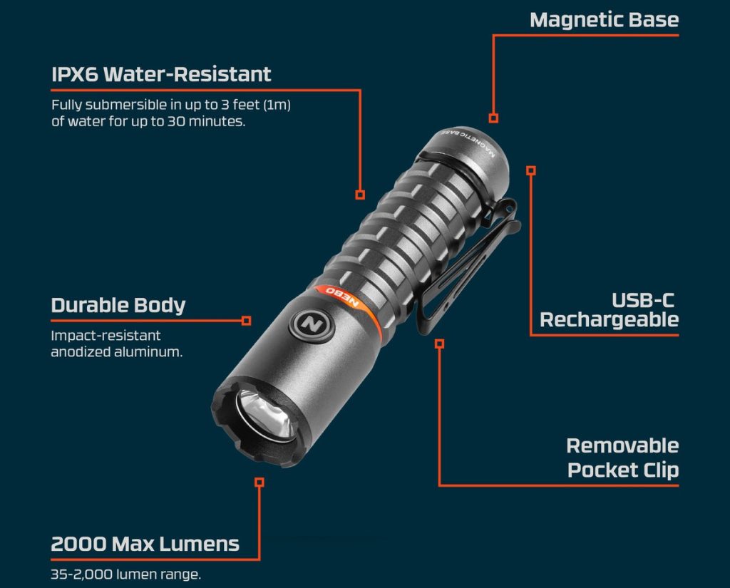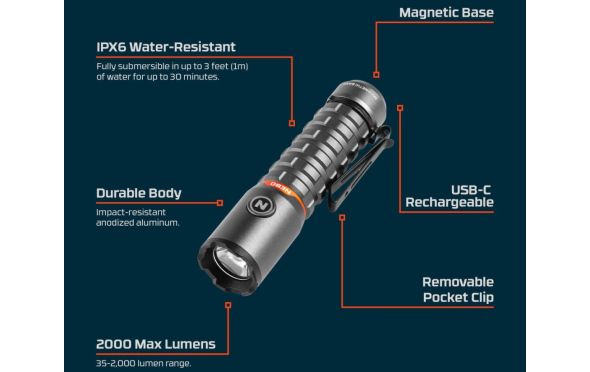 • Ο φακός Torchy 2K της ΝΕΒΟ είναι επαναφορτιζόμενος με USB-C, ανθεκτικός στο νερό (IPX6) και εξοπλισμένος με 5 επιλογές φωτισμού, οι οποίες εναλλάσσονται απρόσκοπτα με την τεχνολογία Smart Power Control.