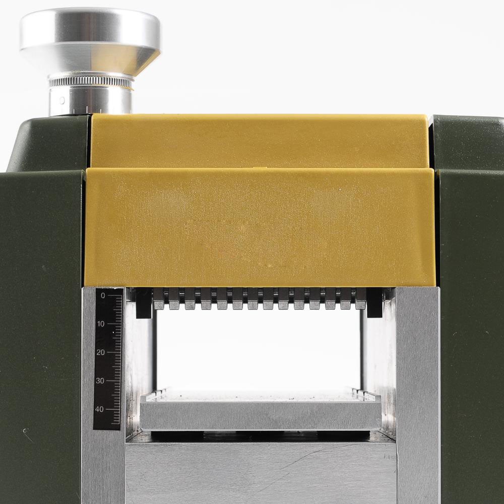 Επιφάνεια εργασίας με τριπλή άτρακτο (κατασκευασμένη από χυτοπρεσαριστό αλουμίνιο και φρεζαρισμένη), η οποία μπορεί να ρυθμιστεί με ακρίβεια έως 1/10mm από ένα τροχό χειρός (μηδενικής ρύθμισης).