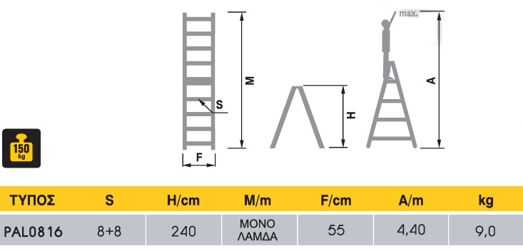 Σκάλα Αλουμινίου Διπλού Συνδιασμού PAL 8+8 Σκαλιά