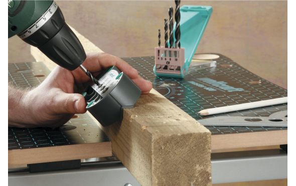Για τρύπημα τετράγωνων οπών με γρήγορο και εύκολο τρόπο Ελαστικά προστατευτικά εμποδίσουν το τρυπάνι να γλιστρίσει πάνω σε λείες επιφάνειες Κατευθυντήριες γραμμές για ακριβείς διατρήσεις Εσωτερικά αυλακώματα V για ασφαλή επισκευή στρογγυλών τεμαχίων εργασίας 5 χαλύβδινα τρυπάνια οδηγοί διαμέτρου 4, 5, 6, 8 και 10mm