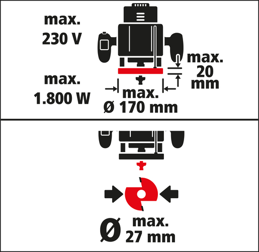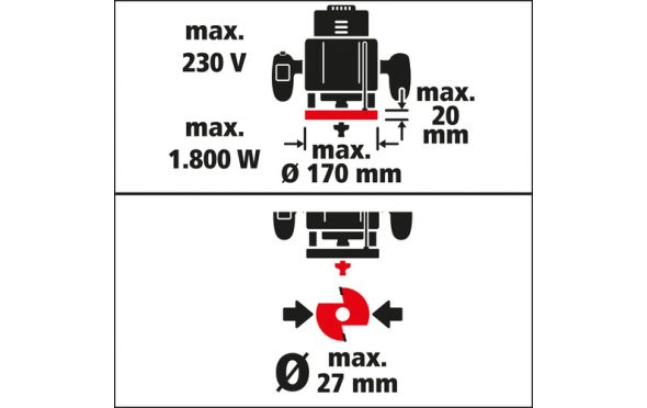 - Γία ρούτερ με μέγιστη ισχύ 1800W, 170mm μέγιστη διάμετρο βάσης και μέγιστο υψος 20mm, και μέγιστη διάμετρο μαχαιριού 27mm