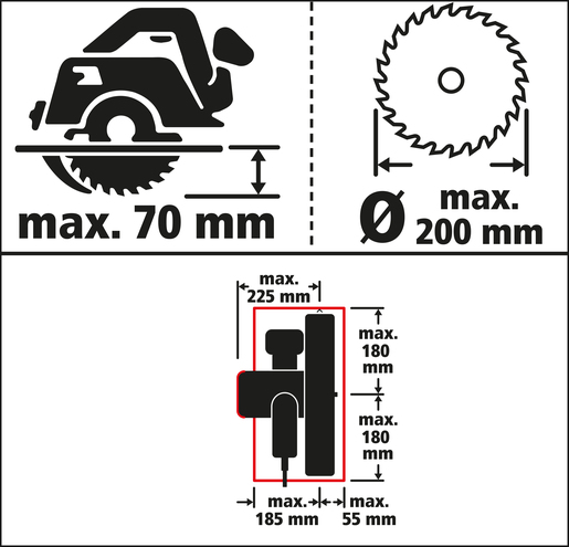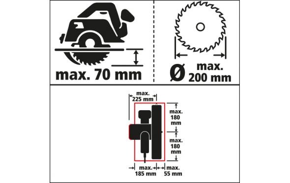 - Κατάλληλο για ολες τις σέγες, για κυκλικά πριόνια χειρός μέχρι 70mm βάθος κοπής και 200mm διάμετρο δίσκου.